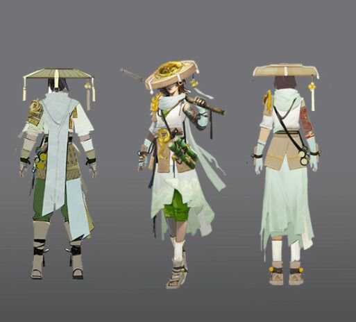 英雄莫問出處,豪情盡在不言中。丐幫高級時裝全體別具巧思,富有一種大巧不工的別致美學顏色。頸肩與下擺處選用國風美學中湛青色海濤江崖紋的規劃,象征丐幫弟子以厚德載物的仁心與好男兒誌在四方豪情。 最令人印象深入的莫過於時裝混搭的潮流規劃,木質甲胄、黃金飾品、絲綢、緞帶多種元素交錯相融,並不給人沖突感,古典質樸的氣質反而與丐幫弟子粗獷豪邁的性格相輔相成。