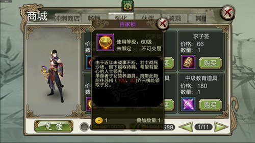 养儿育女不易,但是有个可爱的小宝物肯定会让你得江湖生活更有人情味~下面就跟随大哥一起来看看如何去生育可爱的小baby吧~到达60级,并且已婚的大侠,请先在从商铺中获得“求子签”道具,求子签心诚则灵哟~(一对夫妻持有一个即可)。