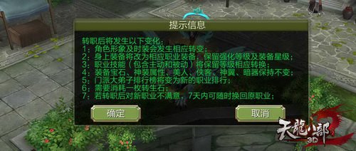 小编发现很多少侠反而对其他门派很感兴趣,各大门派武功招式各不相同,想挨个体会一遍又觉得重新培育练级太费事。真是所谓得不到的永远在骚动呀。      现在全新《天龙八部3D》转职功能现已开启,更有超值活动让你赤色强力伙伴、转生石双双加身,赚的盆满钵满再去体会新工作吧~!达到80级,通过耗费【转生石】。      可在姑苏NPC“转职”处变更为其他工作,转职后人物形象、身上的装备、时装、技术等都将相应转化,宝石、美人、侠客、神装特点、神翼、暗器等将坚持不变。      还可在七天内变换回原工作转职需谨慎,没有最强工作,只要最强的玩家将会对每个大区的充值排行玩家进行额定奖赏发放,即玩家1在本次活动中在混服大区。      (或其他大区如IOS正版/使用宝服)中累计充值额度榜首,将会额定获得排行榜榜首名奖赏赠送的转生石,弥补:转职后人物形象、身上的装备、时装、技术等都将相应转化。      转职后对新人物不满意,话说不久前,装备宝石、美人、侠客、神装特点、神翼、暗器等将坚持不变。转职后对新人物不满意,还可在七天内变换回原工作。